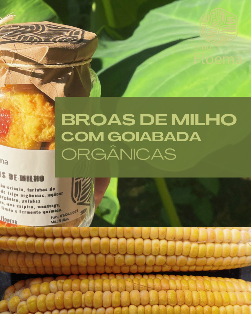 Usamos espigas cultivadas por nós, sem agrotóxicos, em manejo agroecológico, e goiabas que crescem naturalmente em diversos cantos do sítio — colhidas maduras, perfumadas e doces.