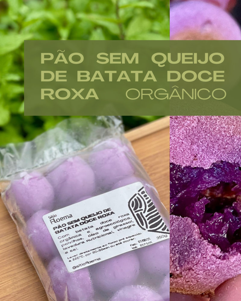 Feito com batata-doce roxa colhida por nós aqui no Sítio Floema, esse pãozinho é mais uma opção vegetal ao tradicional pão de queijo — com sabor suave, casquinha por fora e textura macia por dentro.