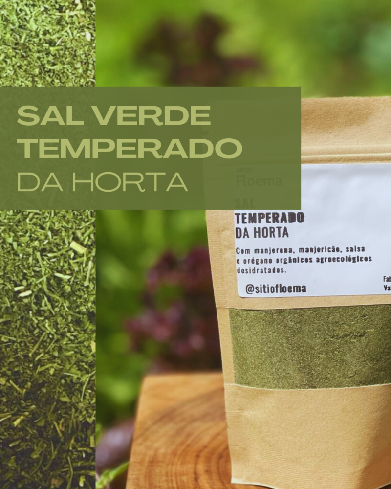 Feito com sal marinho e um mix de ervas frescas da horta — muita salsa, manjericão, manjerona e orégano — todas cultivadas de forma orgânica e agroecológica e desidratadas por nós aqui no Sítio Floema.